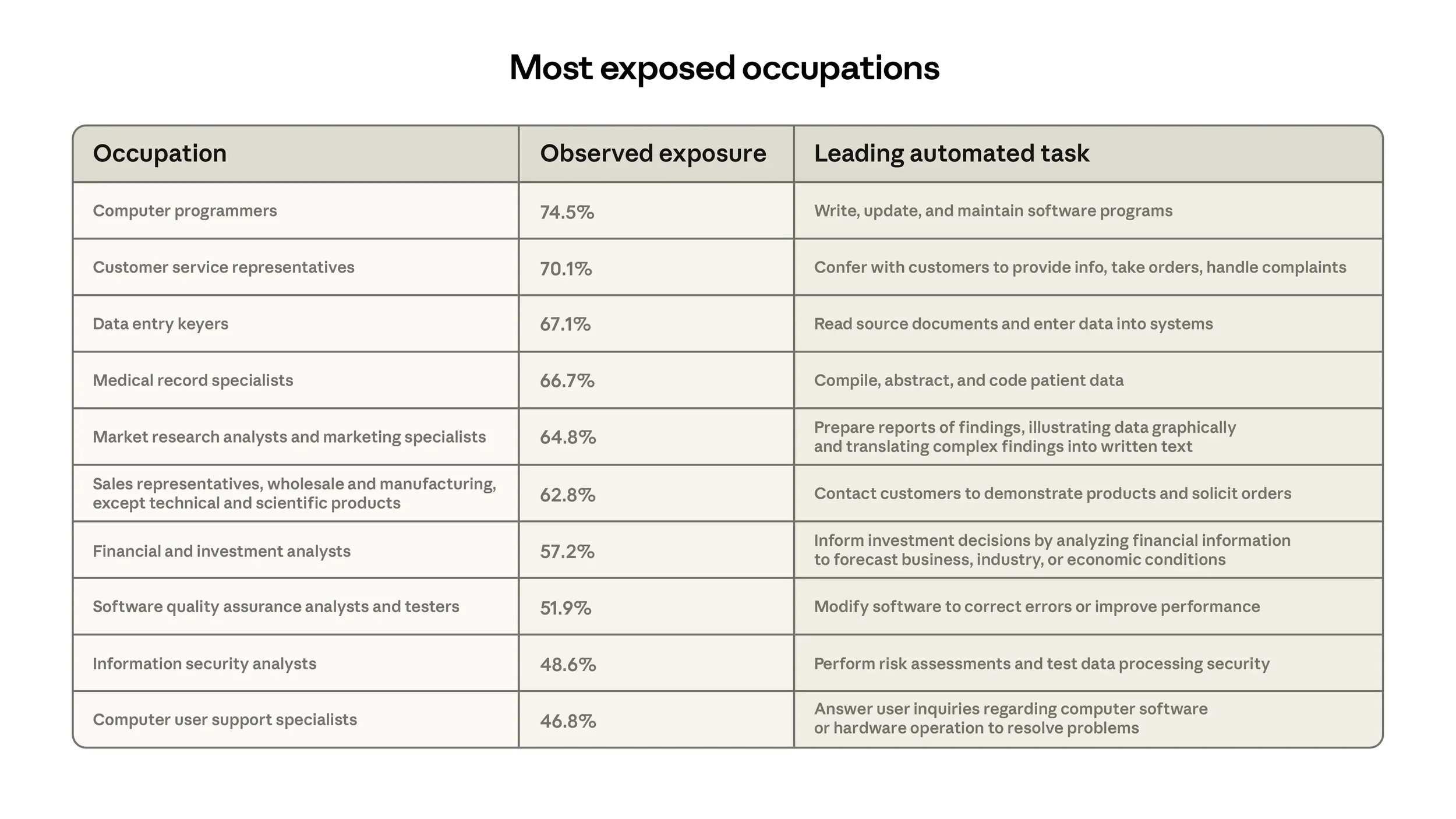 Computer programmers sit at the top of the exposure list, with 75% of their tasks now covered by observed AI usage on Anthropic's platform. Customer service representatives follow closely, driven largely by first-party API traffic, meaning companies are building automated systems on top of Claude to handle customer interactions without human involvement. Data entry keyers are at 67% coverage. Financial analysts, technical writers, and web developers all rank in the top ten.